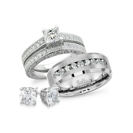 TITANIUM Mens Band and 2 pc Womens Engagement Wedding CZ ...
